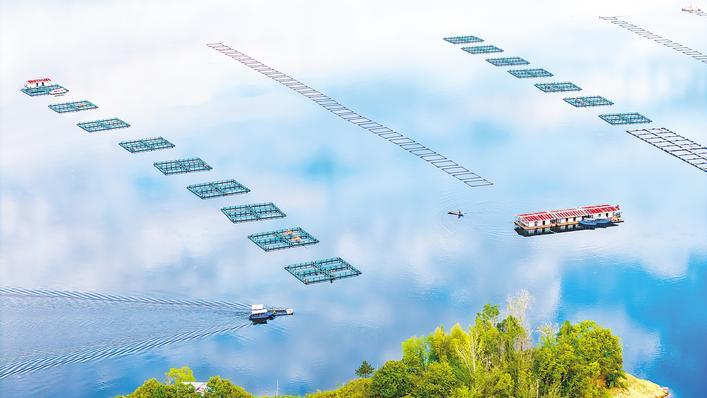 10月24日,在黃岡市白蓮河水庫水域,一個個水產養殖網箱整齊排布,養殖戶駕船在網箱區域忙碌,呈現出一幅生態養殖與碧水藍天相融的現代農業圖景。近年來,白蓮河水庫科學合理放養凈化水質的鰱鳙等特色魚類,推動環境提升、產業增效、農民增收,走出了一條生態與經濟協同發展的綠色之路。(視界網 王江 攝)