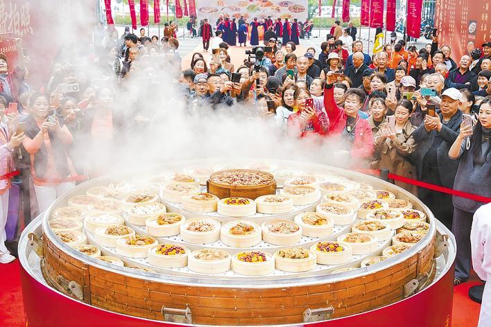 湖北日報訊 (記者楊文漪)10月29日,重陽節(jié)上午,武漢市江夏燕爾閣藝術宴會中心蒸汽彌漫、竹香四溢。一場別開生面的“敬老楚宴·蒸愛江夏”非遺蒸菜銀發(fā)經濟消費盛典在此舉行,直徑達4米的湖北原產巨型蒸籠揭開瞬間,將活動現(xiàn)場氣氛推向高潮。