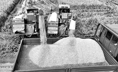 農機在四川農業大學科技示范點卸裝收獲的香稻。新華社發