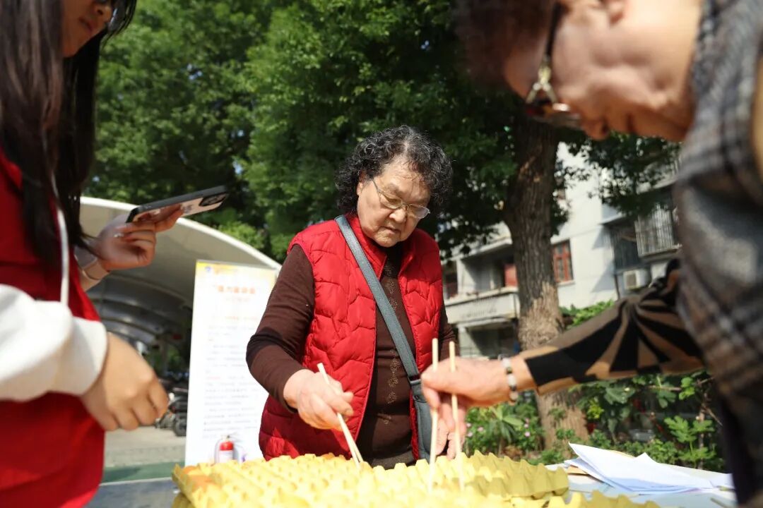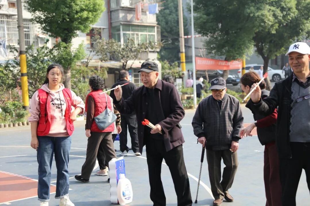 活動現(xiàn)場精心設置了投壺、套圈、益智游戲等集趣味性、參與性與安全性于一體的特色項目。在敬老投壺項目前,大家排隊躍躍欲試。瞄準目標、手腕輕揚,投箭精準落地,“中了!”場邊頓時出現(xiàn)一片喝彩。福氣套圈區(qū)域人氣“爆棚”,老同志手持彩圈,瞄準、甩手,動作一氣呵成。默契夾球更是考驗著大家的專注與配合,兩兩一組,全神貫注,動作沉穩(wěn),筷子穩(wěn)夾快移,一旁觀戰(zhàn)的連聲叫好,現(xiàn)場氣氛熱烈。