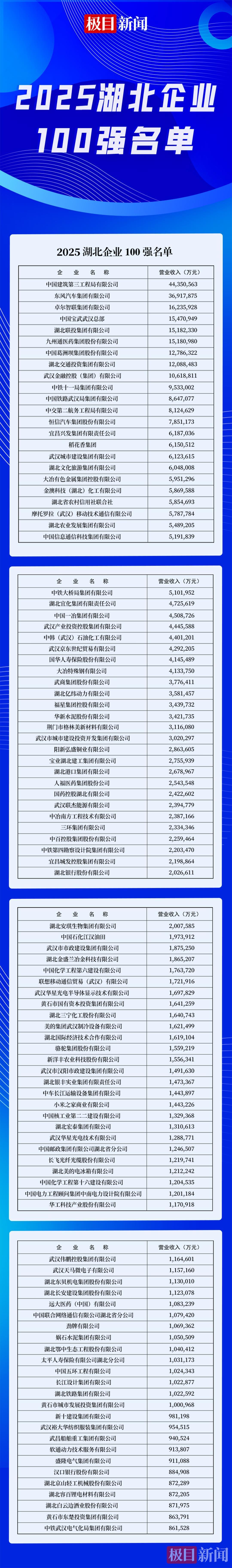 2025湖北企業三項100強榜單,遵循國際通行的慣例,以企業上年度營業(銷售)收入為入圍標準,根據企業自愿申報并經審計的各項指標數據,由湖北省企聯湖北企業三項100強分析發布活動辦公室調研、審核、分析,報湖北省企聯湖北企業三項100強分析發布活動領導小組審定,并報湖北省國資委后產生。