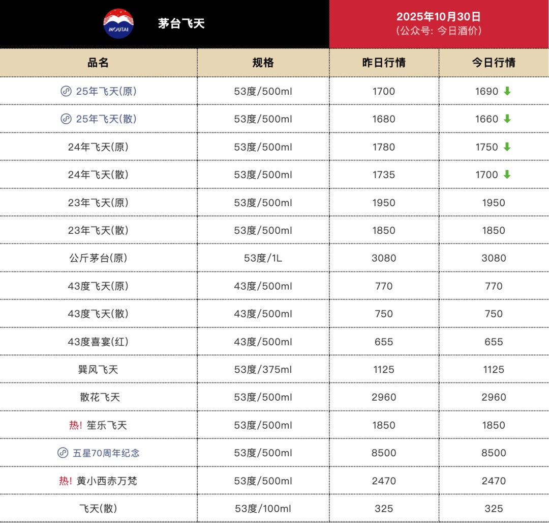 今日酒價披露的批發(fā)參考價顯示,10月30日,25年飛天茅臺原箱較前一日下跌10元,報1690元/瓶;25年飛天茅臺散瓶較前一日下跌20元,報1660元/瓶。24年飛天茅臺原箱較前一日下跌30元,報1750元/瓶;24年飛天茅臺散瓶較前一日下跌35元,報1700元/瓶。