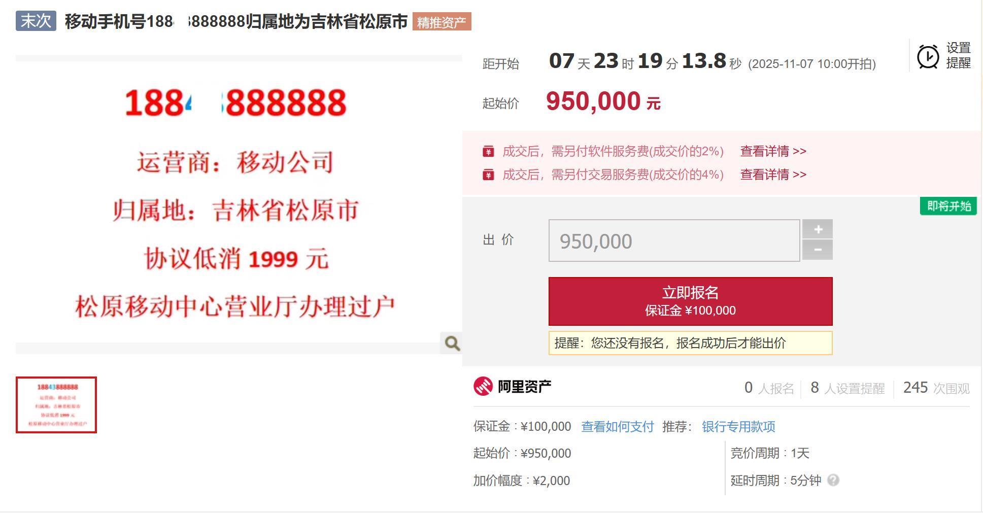 10月30日,極目新聞記者從阿里司法拍賣平臺獲悉,歸屬地為吉林松原市移動手機號188**888888,將于11月7日進行拍賣,起拍價格為95萬元。