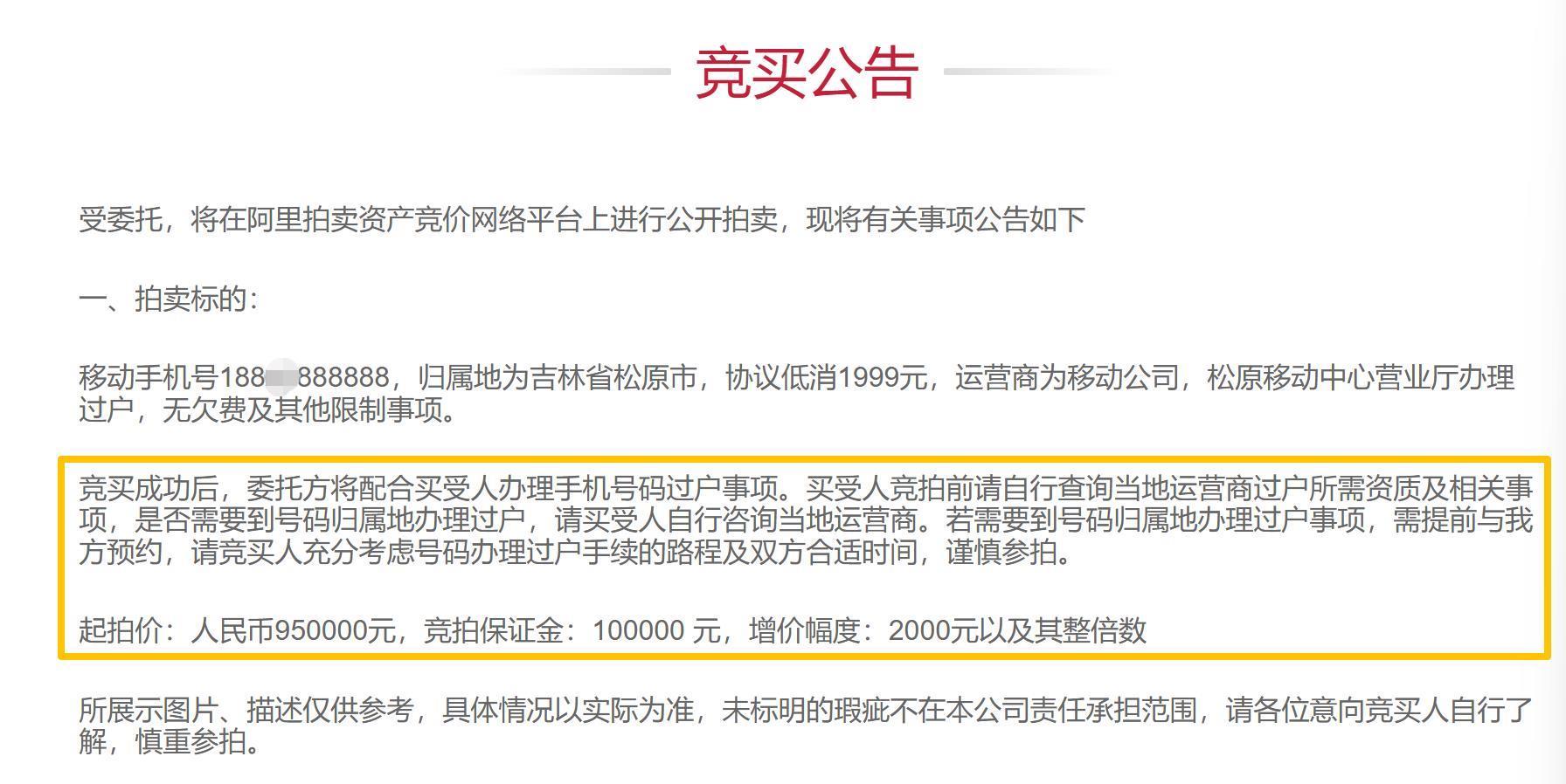 競買公告中提到,該移動手機號188**888888起拍價95萬元,競拍保證金10萬元,增加幅度為2000元(以及其整倍數)。買受人競拍前請自行查詢當地運營商過戶所需資質及相關事項,是否需要到號碼歸屬地辦理過戶,請買受人自行咨詢當地運營商。競買成功后,委托方將配合買受人辦理手機號碼過戶事項。