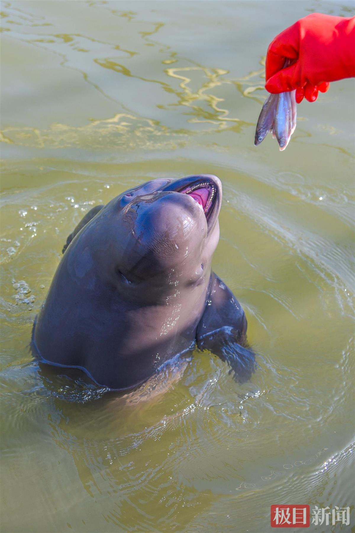 湖北長江天鵝洲白鱀豚國家級自然保護區,江豚飼養員丁澤良在喂養江豚(極目新聞記者 李輝 攝)