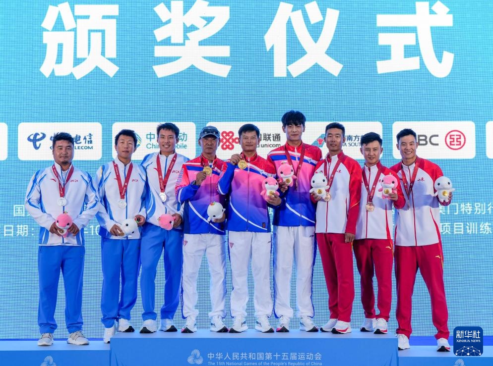 10月29日,男子49人級冠軍上海隊選手汪鑫(中)/戚天宇(右四)、亞軍浙江隊選手溫在鼎(左二)/呂紅鳴(左三)、季軍山東隊選手丁銘良(右二)/劉添(右一)與他們的教練在頒獎儀式上。