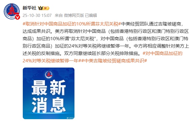 據@新華社 10月30日消息,中美經貿團隊通過吉隆坡磋商,達成成果共識。美方將取消針對中國商品(包括香港特別行政區和澳門特別行政區商品)加征的10%所謂“芬太尼關稅”,對中國商品(包括香港特別行政區和澳門特別行政區商品)加征的24%對等關稅將繼續暫停一年。中方將相應調整針對美方上述關稅的反制措施。雙方同意繼續延長部分關稅排除措施。