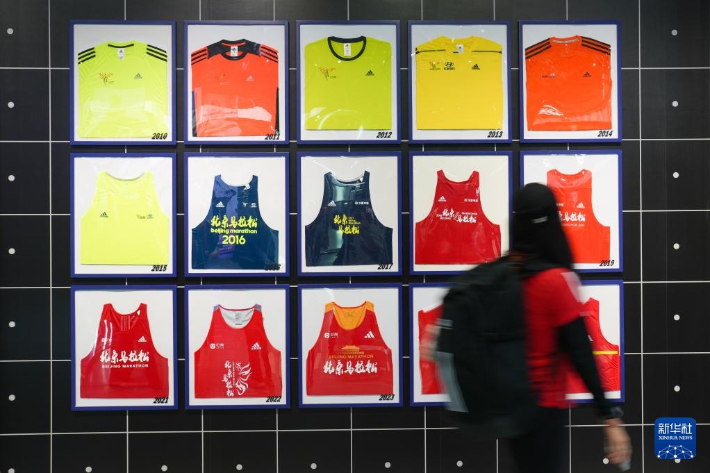 10月30日,一位參觀者在觀看歷年北京馬拉松賽參賽服。