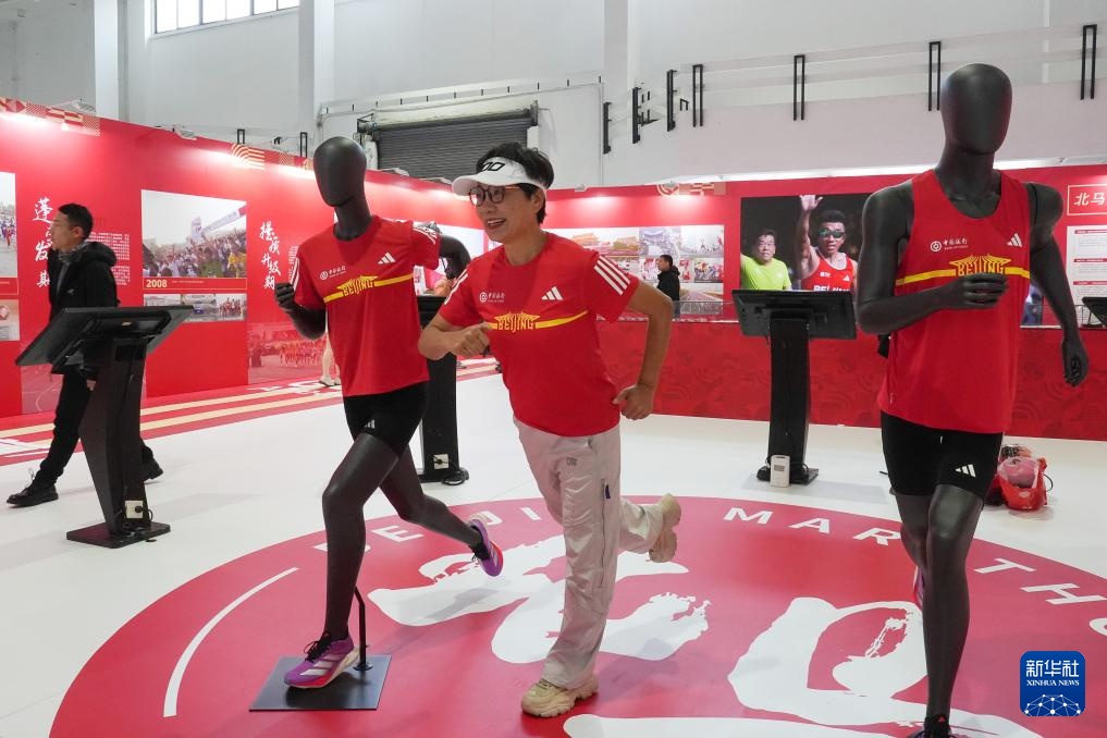 10月30日,一名2025北京馬拉松參賽者在2025北京馬拉松博覽會上留影。