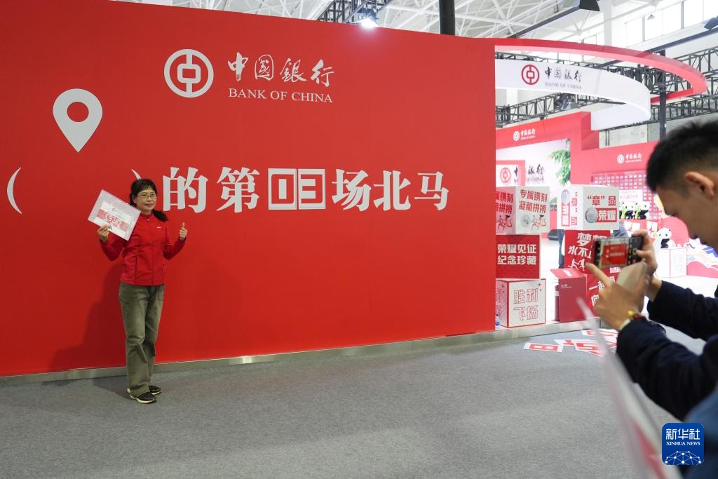 10月30日,一名2025北京馬拉松參賽者在2025北京馬拉松博覽會上拍照留念。