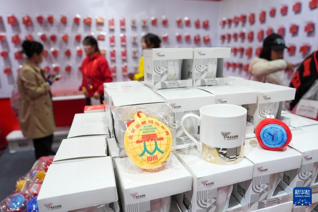 10月30日,參觀者在2025北京馬拉松博覽會上選購官方特許商品。