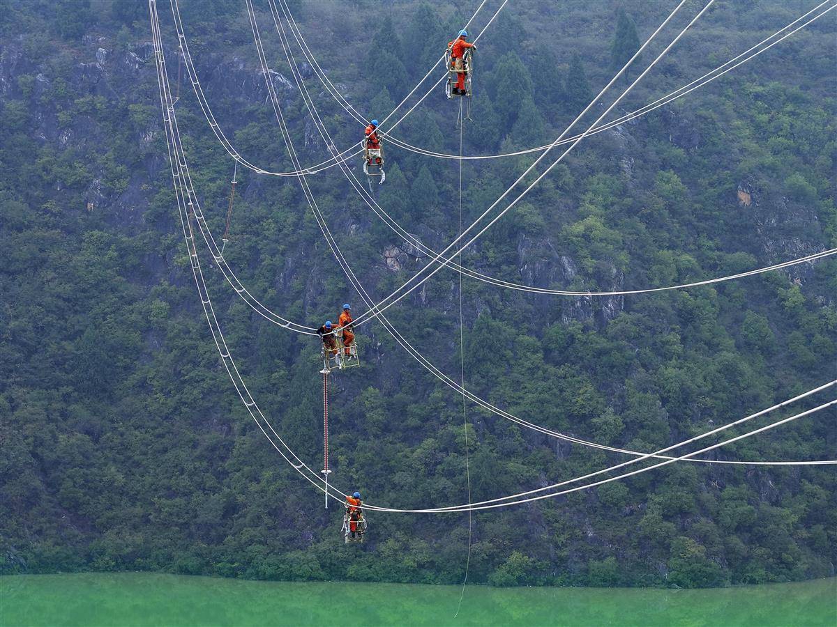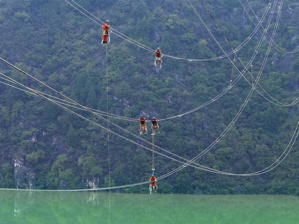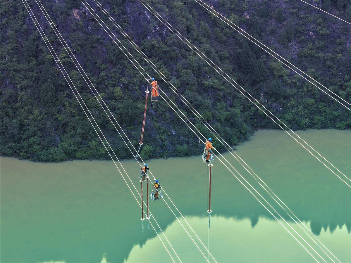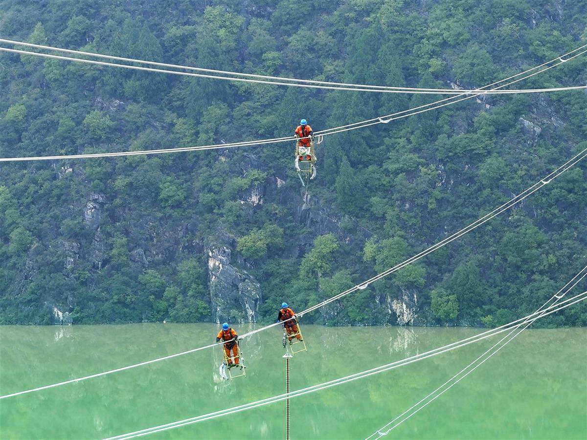10月22日,在十堰鄖陽區青山鎮琵琶灘村的漢江河谷,國網十堰供電公司5名施工人員攀上高空,腳踩飛車、身系安全繩沿著導線在百米高空安裝避雷器、間隔棒等附件設備。