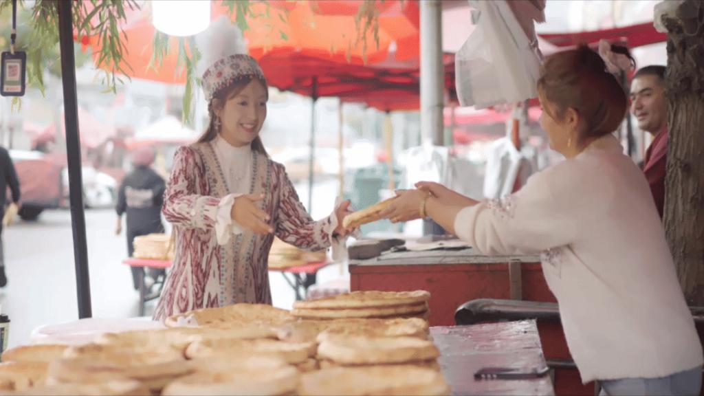 蘇比努爾·阿卜杜麥麥提身著民族服飾采購用于接待游客的早餐。受訪者供圖