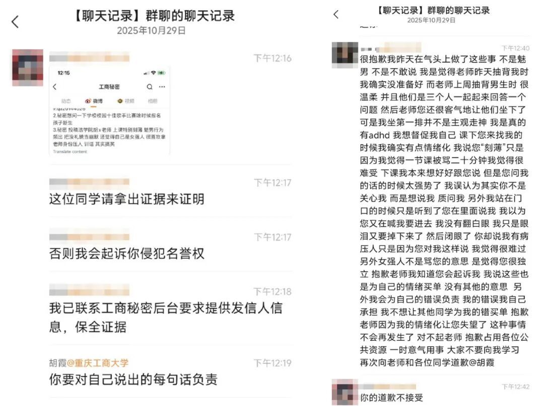 10月28日,重慶工商大學女生李某在社交平臺投訴老師“刻薄媚男”引發關注。隨后,涉事老師將投訴內容截圖發至學生群中,并表示:請拿出證據,否則將起訴李某侵犯名譽權。盡管該女生道歉認錯,但老師并未原諒。