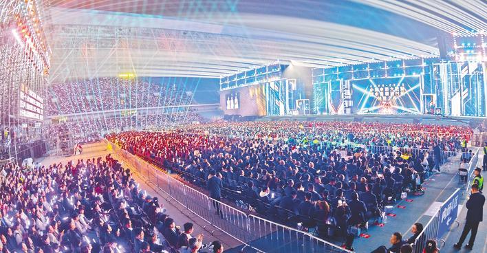 19時,奧體中心燈光驟熄,無數(shù)光束如利劍般刺破夜空,在夜幕中切割出流動的光影軌跡,瞬間將會場打造成未來感十足的科技殿堂。