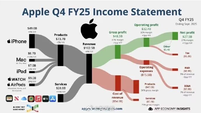 當地時間10月30日,蘋果公司發布2025財年第四季度財務業績報告,蘋果第四財季營收1024.7億美元,同比增長7.9%;第四財季每股收益1.85美元,同比增長90.72%。