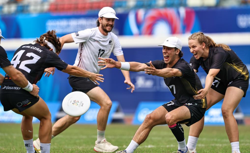 8月16日,德國隊在比賽中慶祝得分。當日,在2025年成都世運會團隊飛盤銅牌賽中,法國隊戰勝德國隊,奪得銅牌。新華社記者 孫凡越 攝