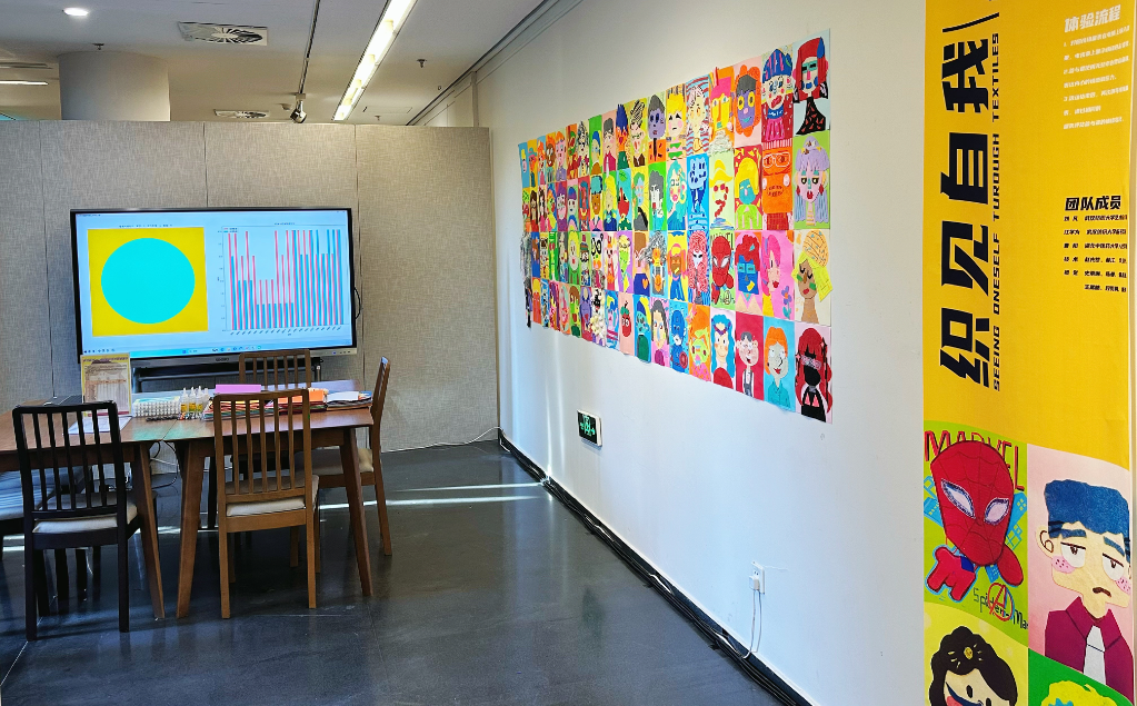 “織見自我”項目以柔軟的無紡布為媒材,在一小時的體驗活動中完成“情緒量表—手工縫制—數(shù)據(jù)對比”的閉環(huán)。參展觀眾先填寫PANAS情緒量表,隨后在劉凡團隊指導(dǎo)下完成無紡布制作的紡織材料,系統(tǒng)計算出情緒變化并呈現(xiàn)出情緒的顏色;完成后再測一次,生成“個人情緒溫差圖”。通過數(shù)據(jù)比對,參與者在愉悅感和自我接納等正向情緒方面都有系統(tǒng)性增強。