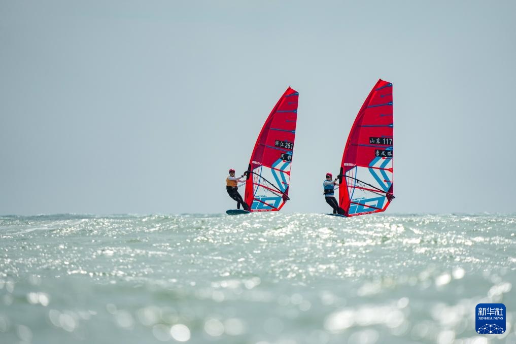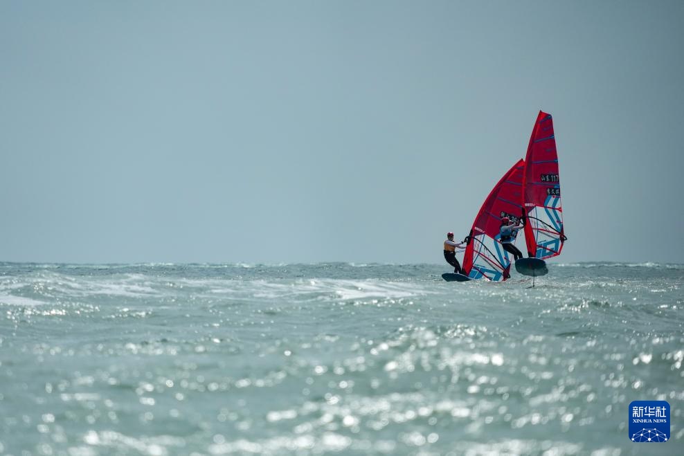 10月30日,浙江隊選手閆錚(左)和山東隊選手李文琪在女子水翼帆板級比賽中。最終,閆錚和李文琪分獲冠軍和季軍。