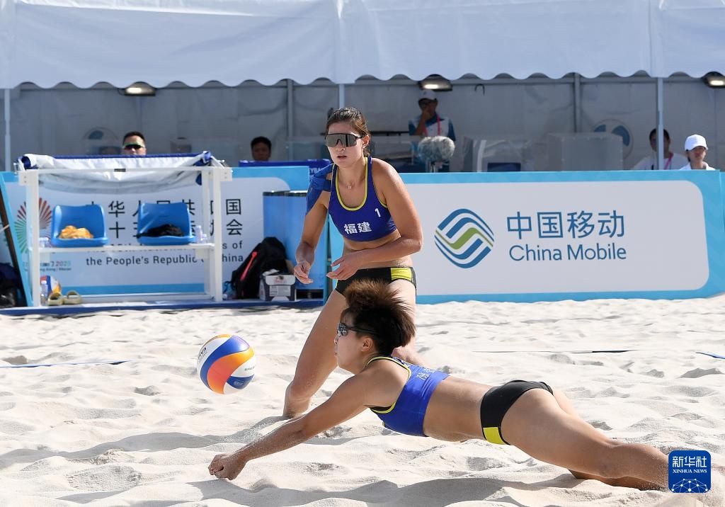 10月31日,福建二隊組合陳集涵(左)/陳瑩珊在女子小組賽A組比賽中。最終,她們2比0戰勝山西隊組合楊思宇/崔睿萱。