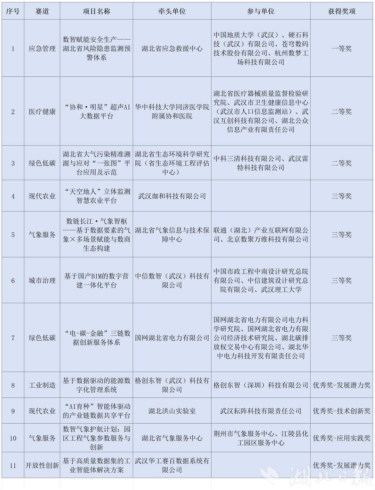湖北日報訊(記者劉天縱、通訊員李青)今年“數據要素×”大賽全國總決賽,湖北共有11個項目獲獎,獲獎項目總數居全國第五,中部第一。其中,“數智賦能安全生產——湖北省風險隱患監測預警體系”項目獲應急管理賽道一等獎。