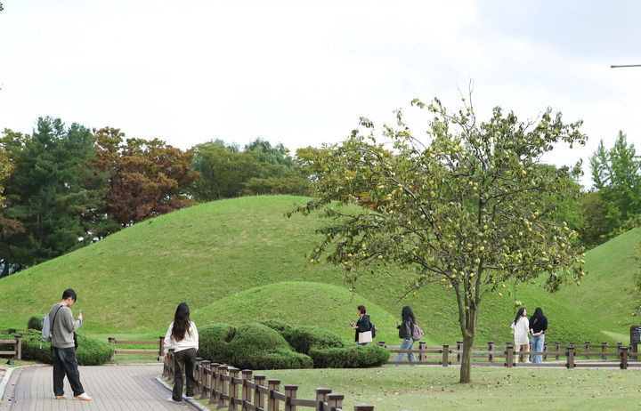 慶州市中心的大陵苑是1000多年前新羅王朝時期的墓葬群,這里共有20多座王陵與貴族墓,隆起的“土堆”錯落有致,構(gòu)成一片靜默的波浪。草坡的綠意仍在延續(xù),枝頭的柿子卻已被秋陽染成金黃。一樹一丘,一黃一綠,如油畫般層次分明,古老的王陵在這柔和的色調(diào)中更顯寧靜和浪漫,恰是慶州秋天最靜美的時刻。