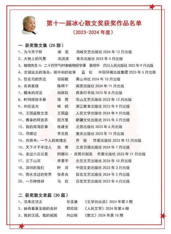 10月30日,第十一屆冰心散文獎在貴州仁懷揭曉,51部(篇)作品獲獎。