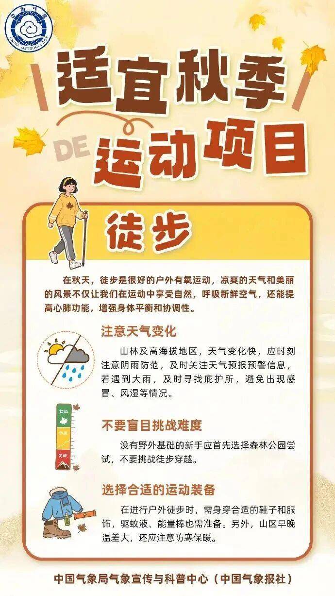 武漢市氣象局提醒,秋高氣爽的好天氣,很多人都喜歡外出登高望遠。大家登高賞秋時,注意選擇一雙舒適的鞋,還可以攜帶登山杖,以輕松愜意為主,最好選擇身體能夠接受的運動強度不宜逞強。