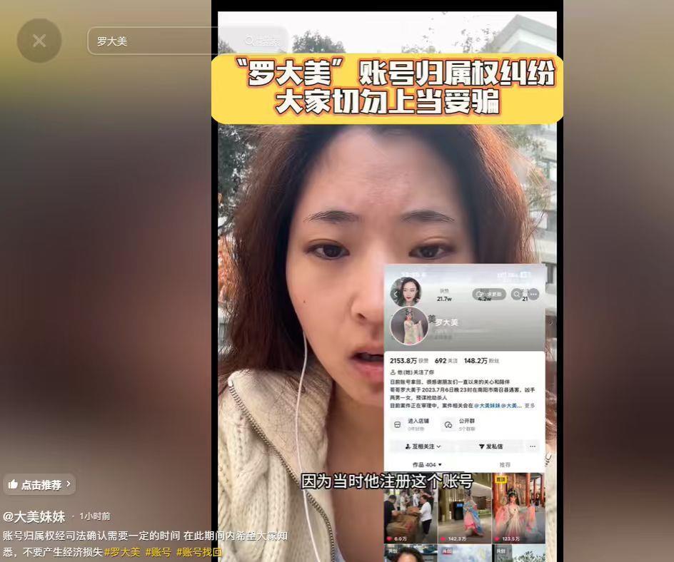 羅大美的妹妹尚女士在視頻中介紹,名為“羅大美”的抖音賬號,當前存在歸屬權糾紛。以他哥哥網名“羅大美”注冊的賬號,雖然哥哥是實際使用人,但是他當時用的是他朋友的實名信息注冊。近幾天,因哥哥的這位朋友把第三方綁定的登錄方式全部移除,現在綁定的是對方的手機號和實名信息,導致他們家屬沒有辦法登錄。他們也試圖與這位哥哥生前所謂的朋友聯系過多次,但對方不回復,下一步他們可能考慮采用法律手段拿回哥哥的賬號。