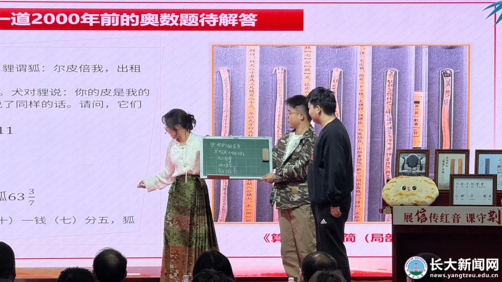 “狐、貍、犬出關,租百一十一錢……”課程互動環節,物理與光電學院胡瀟文同學現場解題,用現代數學破解西漢算術簡中的難題,引來陣陣掌聲。