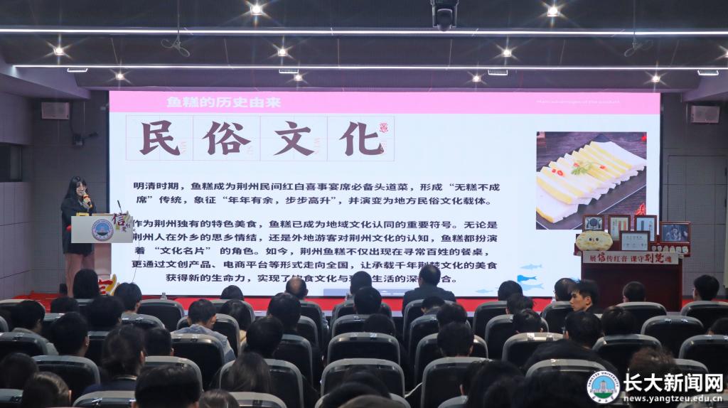 如何讓古老文化“活”在當下?牟菲以荊州魚糕、鍋盔等特色食品為例,講述文創設計如何助力荊楚文化“破圈”傳播,激發學生濃厚興趣。