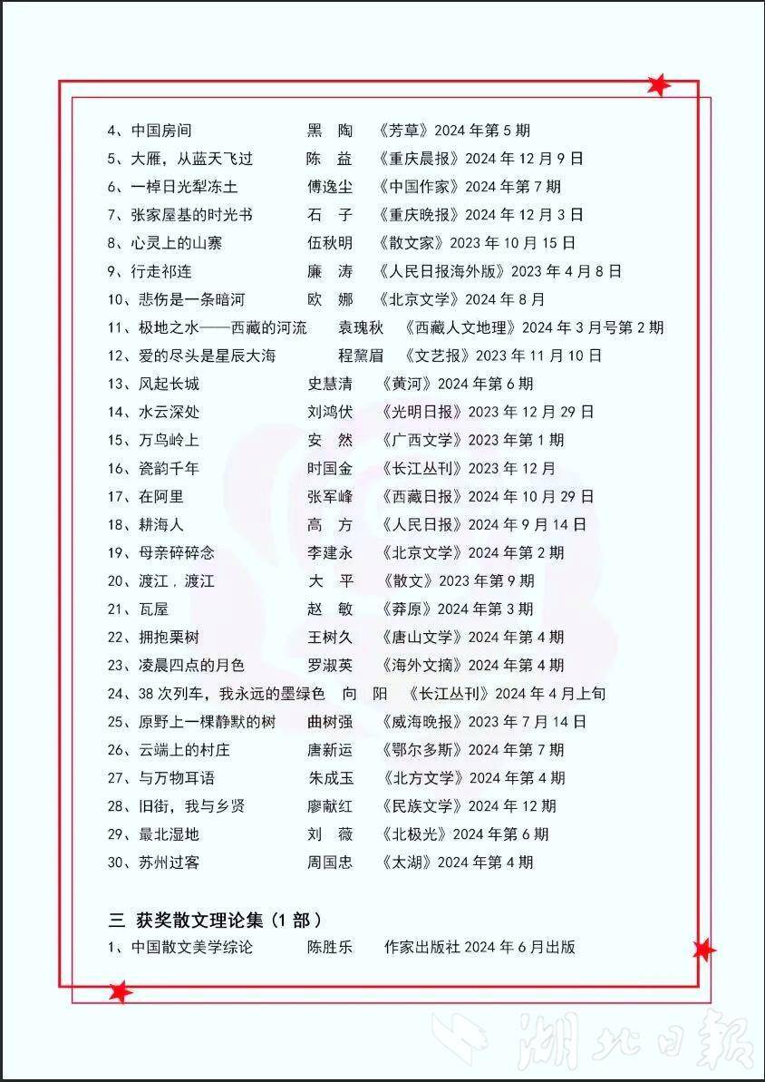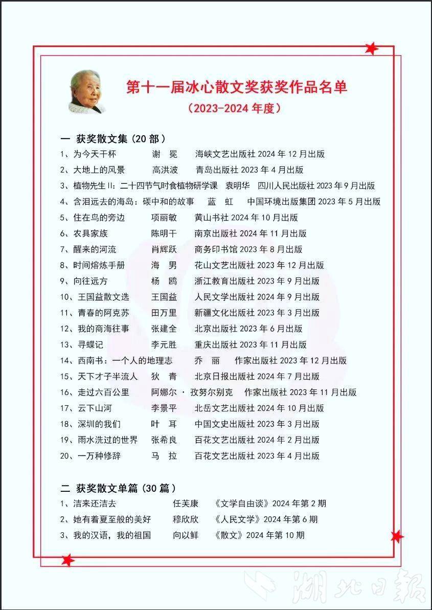 湖北日?qǐng)?bào)訊(記者農(nóng)新瑜、通訊員沈作)10月30日,中國(guó)散文權(quán)威獎(jiǎng)項(xiàng)——第十一屆冰心散文獎(jiǎng)在貴州仁懷揭曉并舉行頒獎(jiǎng)典禮,20部作品獲得散文集獎(jiǎng),30篇作品獲得散文單篇獎(jiǎng),1部專(zhuān)著獲散文理論獎(jiǎng)。其中,湖北兩位作家和多部作品獲獎(jiǎng)。