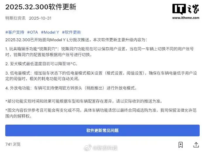 據新浪科技10月31日消息,特斯拉今日宣布向 Model Y L 推送最新的 2025.32.300 軟件更新,正式支持“外放電”功能。
