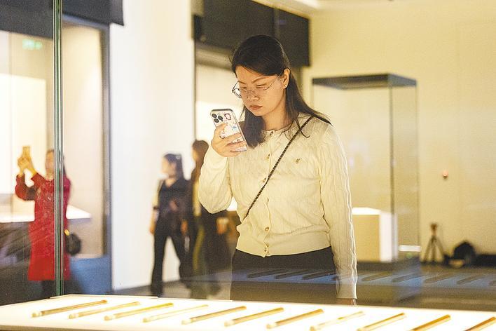 觀眾在簡(jiǎn)牘展品前駐足拍照。 (湖北日?qǐng)?bào)全媒記者 何宇欣 攝)