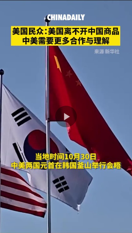 當地時間10月30日,中美兩國元首在韓國釜山舉行會晤。中國日報記者走訪美國街頭,了解美國民眾對此次會晤及中美關系的看法。民眾表示,美國和中國的貿易互依關系不容忽視,兩國需要更多溝通與合作。