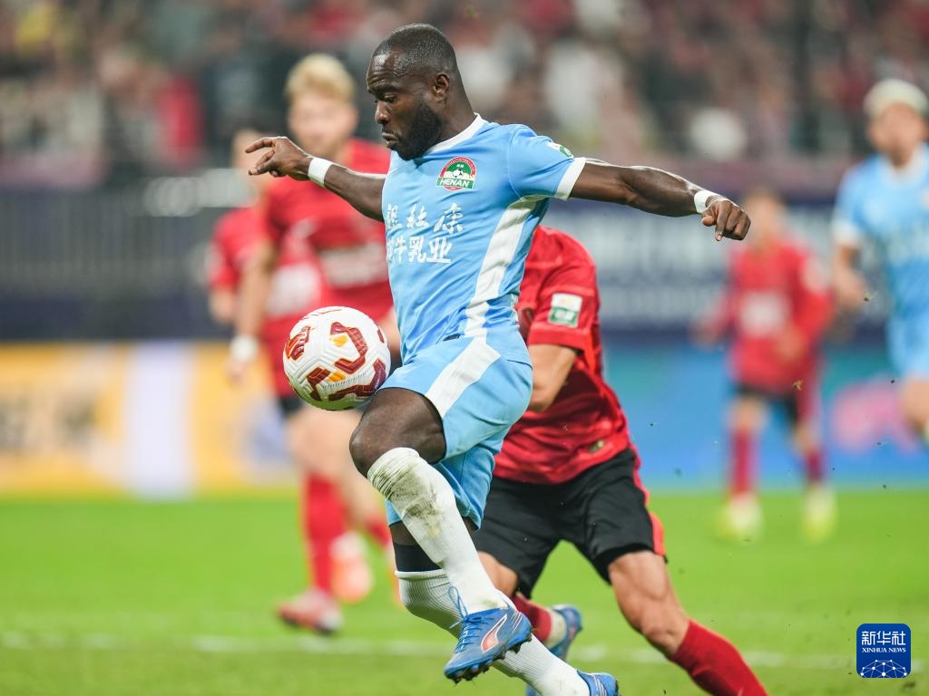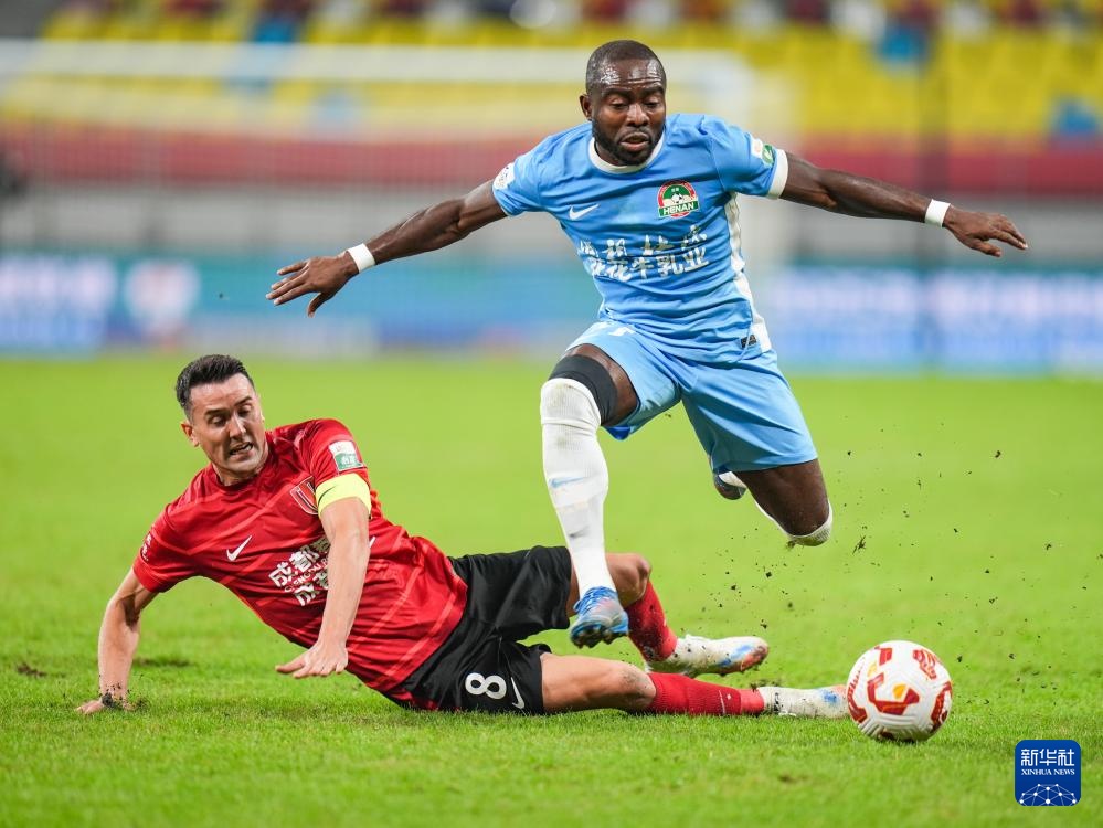 10月31日,河南俱樂(lè)部酒祖杜康隊(duì)球員納薩里奧(右一)在比賽中射門(mén)。