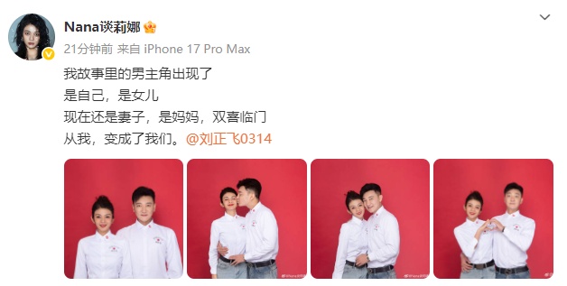 11月1日,“09快女”、《一起又看流星雨》“蔣媛”扮演者談莉娜發博官宣結婚懷孕,“我故事里的男主角出現了”,“現在還是妻子,是媽媽,雙喜臨門”。