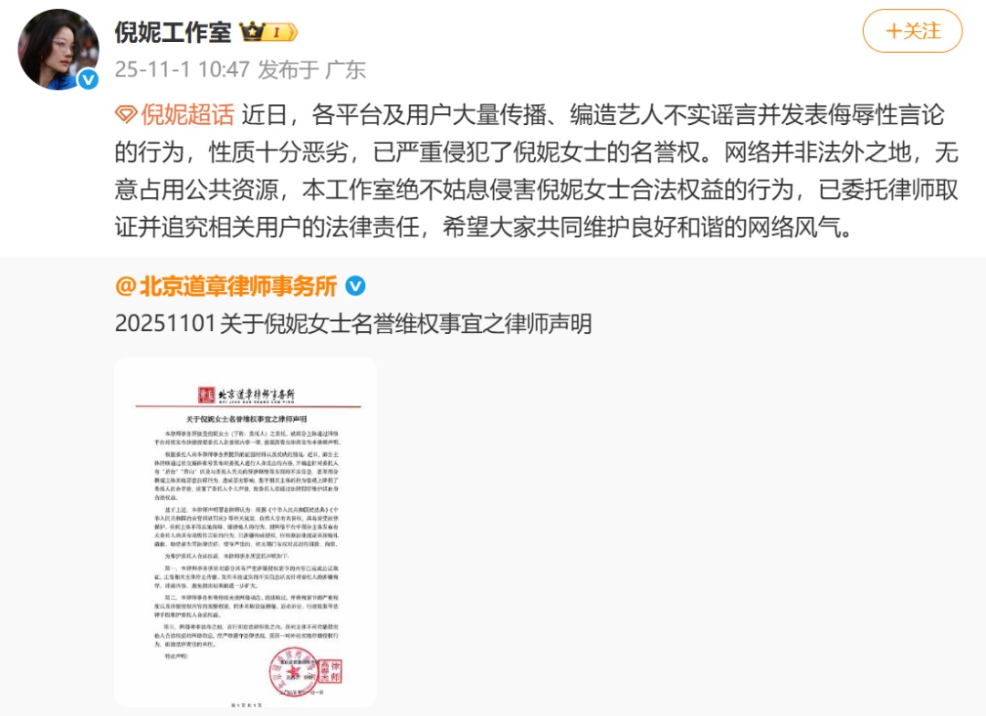 其工作室隨后轉發該聲明并發文稱:近日,各平臺及用戶大量傳播、編造藝人不實謠言并發表侮辱性言論的行為,性質十分惡劣,已嚴重侵犯了倪妮女士的名譽權。網絡并非法外之地,無意占用公共資源,本工作室絕不姑息侵害倪妮女士合法權益的行為,已委托律師取證并追究相關用戶的法律責任,希望大家共同維護良好和諧的網絡風氣。