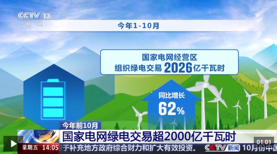 最新數(shù)據(jù)顯示,今年1—10月,國(guó)家電網(wǎng)經(jīng)營(yíng)區(qū)組織綠電交易2026億千瓦時(shí),同比增長(zhǎng)62%。