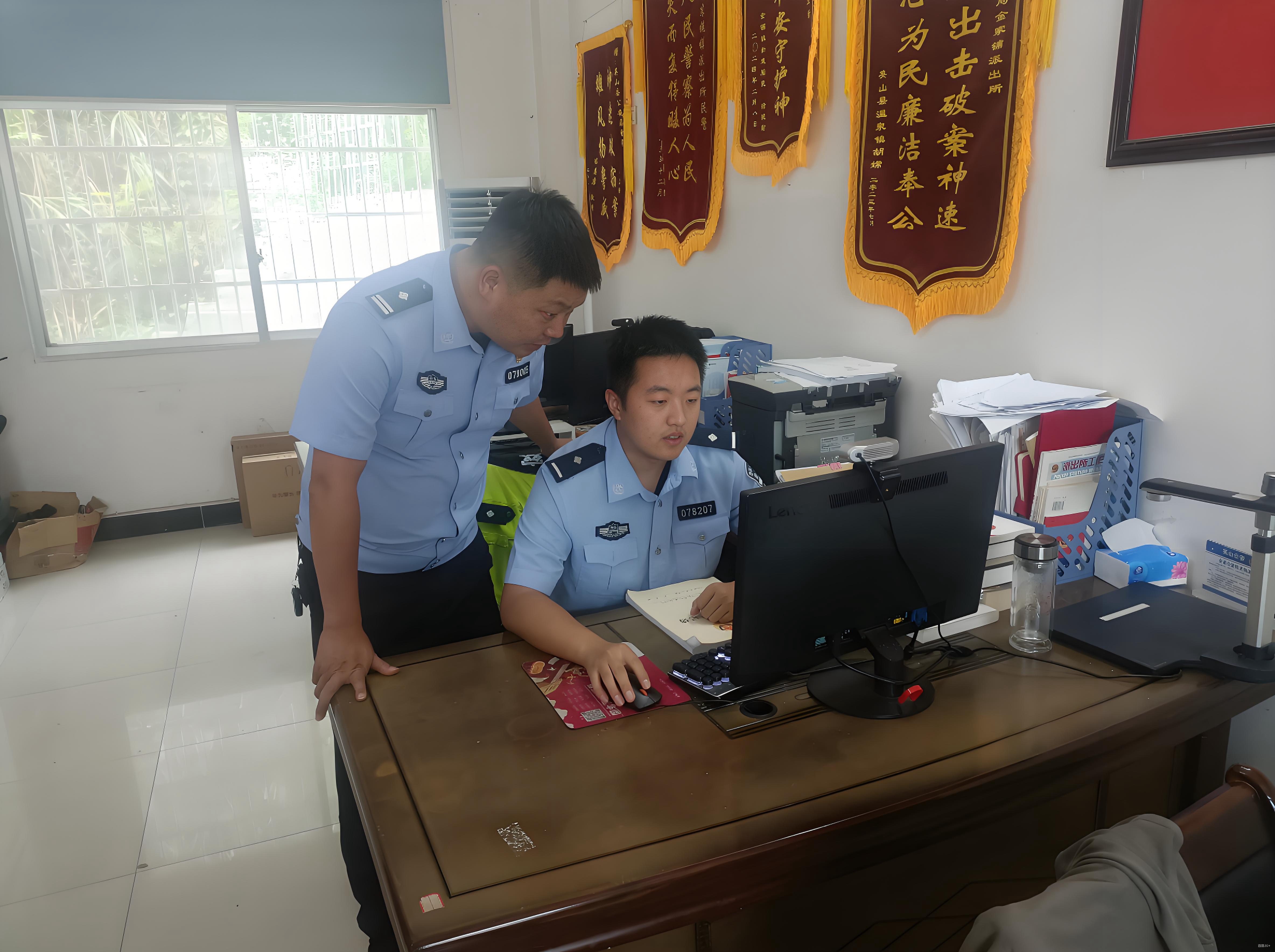 袁創(chuàng)(左)指導(dǎo)民警辦理案件。