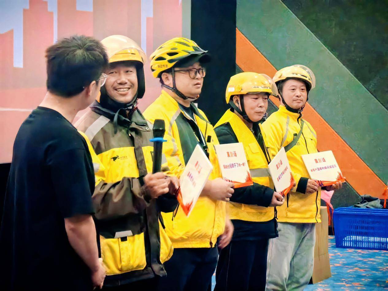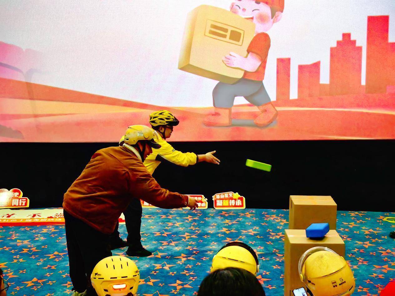 互動環節里,真實故事引發全場共情。快遞員老周談及難忘經歷:“去年夏天爬28樓送件,住戶大姐硬塞來冰西瓜,那句‘小伙子辛苦了’,讓所有疲憊都煙消云散,這股甜到現在都記得。”外賣騎手小吳則分享雨夜善舉:“送餐時遇路人低血糖暈倒,當即停下單車買糖喂水,哪怕被催單也沒慌,人命永遠是第一位的。”樸實話語贏得陣陣掌聲。隨后的“精準投快遞”趣味挑戰賽更將氛圍推向高潮——模擬配送場景的比拼中,“小哥”們化身“投遞達人”,在歡笑中拉近彼此距離,社區準備的暖手寶、騎行支架等實用獎品,盡顯對他們出行安全的細致牽掛。