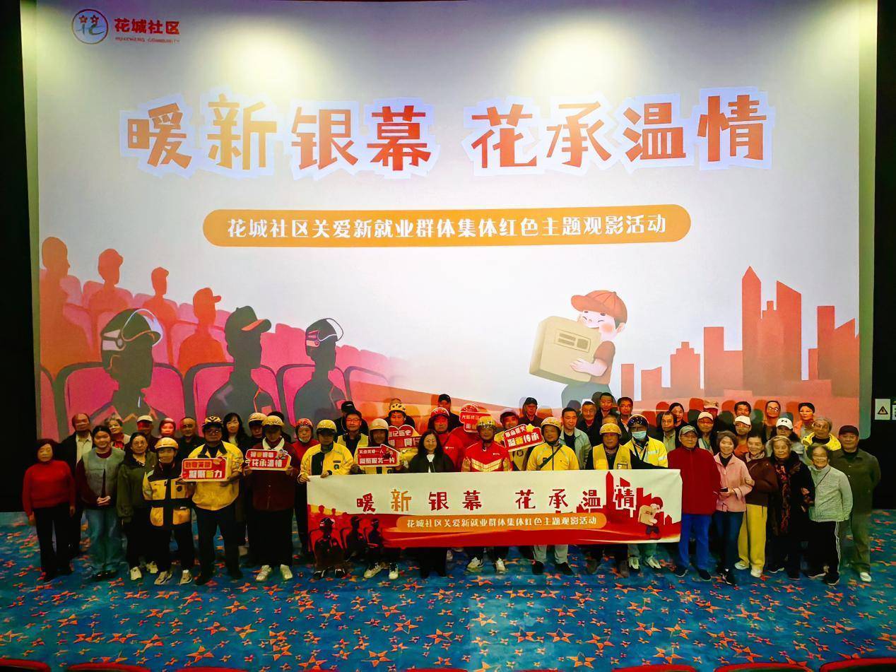 10月30日,武漢市東西湖區金銀湖街道花城社區在199+銀興影城(金銀湖店)溫情啟幕“暖新銀幕 花承溫情”關愛活動,70余名快遞小哥、外賣騎手與黨員代表齊聚,在故事分享、趣味互動與紅色光影交織中,收獲專屬社區的秋日暖意。