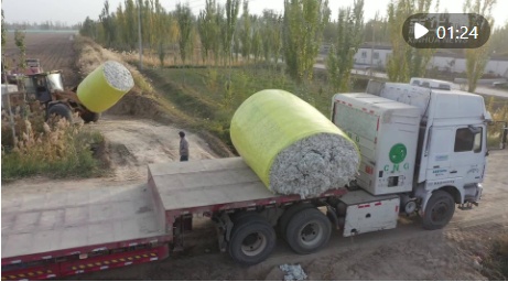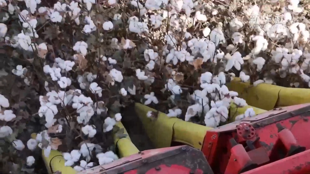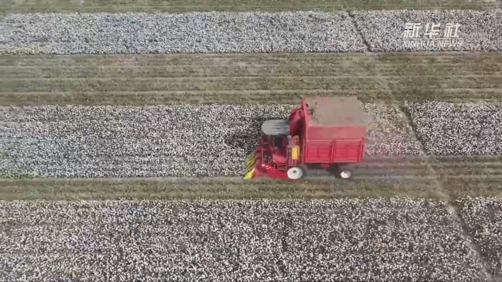 數臺大型采棉機穿梭其間,朵朵棉花被采棉機采摘、收集、打包、出倉,棉田里一派豐收繁忙景象。
