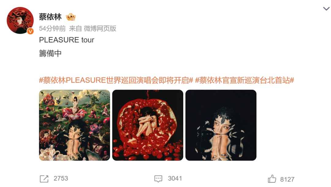 歌手蔡依林今天發文宣布,最新巡演Pleasure Tour首站定于2025年12月30日、31日及2026年1月1日,共3場,更為矚目的是,首站是在可容納四萬人的中國臺北大巨蛋舉行,這也是蔡依林首次挑戰超大型場館。
