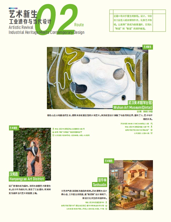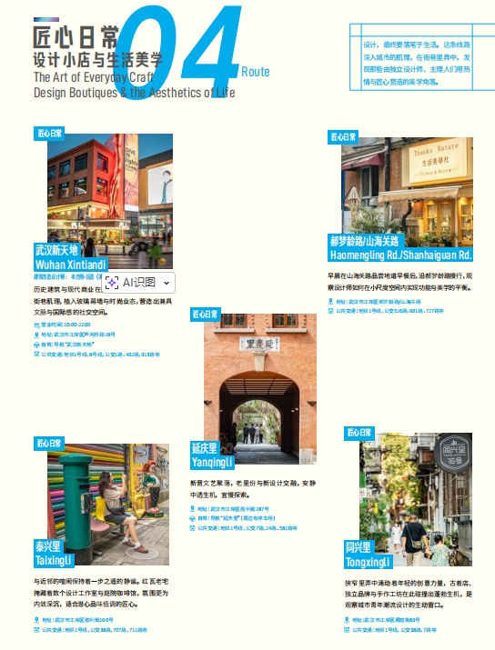 本次活動同步發布“設計漫游”Designwalk四大主題路線,將整座武漢變成了“流動的設計展廳”。現場許多市民踴躍領取漫游地圖,紛紛拍照記錄路線詳情。四大路線包括:“百年風貌”路線:串聯江漢關博物館、中山大道、黎黃陂路等歷史建筑;“藝術新生”路線:涵蓋琴臺美術館、漢陽造創意園、曇華林等藝術空間;“城市蛻變”路線:包括武漢長江二橋、知音號、楊泗港長江大橋等工程杰作;“匠心日常”路線:深入郝夢齡路、山海關路、延慶里等特色街巷。