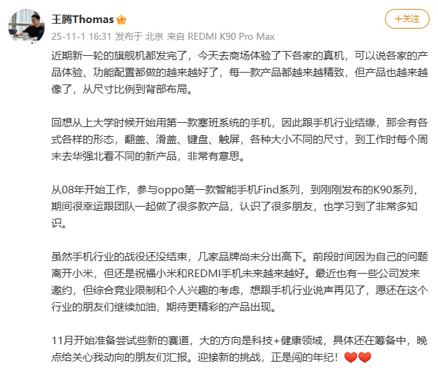 雖然手機(jī)行業(yè)的戰(zhàn)役還沒結(jié)束,幾家品牌尚未分出高下。前段時(shí)間因?yàn)樽约旱膯栴}離開小米,但還是祝福小米和REDMI手機(jī)越來越好。最近也有一些公司發(fā)來邀約,但綜合競(jìng)業(yè)限制和個(gè)人興趣的考慮,想跟手機(jī)行業(yè)說聲再見了,愿還在這個(gè)行業(yè)的朋友們繼續(xù)加油。11月開始準(zhǔn)備嘗試些新的賽道,大的方向是科技+健康領(lǐng)域,具體還在籌備中。