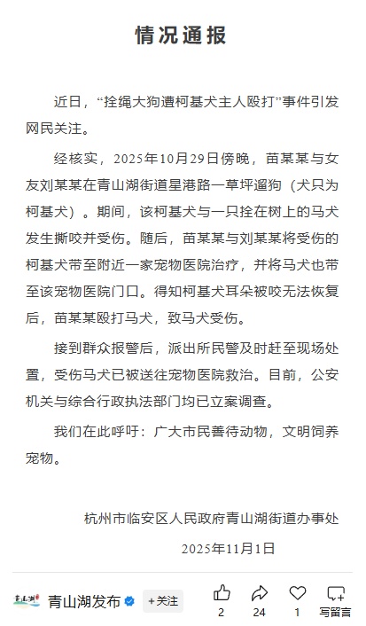 經(jīng)核實(shí),2025年10月29日傍晚,苗某某與女友劉某某在青山湖街道星港路一草坪遛狗(犬只為柯基犬)。期間,該柯基犬與一只拴在樹上的馬犬發(fā)生撕咬并受傷。隨后,苗某某與劉某某將受傷的柯基犬帶至附近一家寵物醫(yī)院治療,并將馬犬也帶至該寵物醫(yī)院門口。得知柯基犬耳朵被咬無法恢復(fù)后,苗某某毆打馬犬,致馬犬受傷。