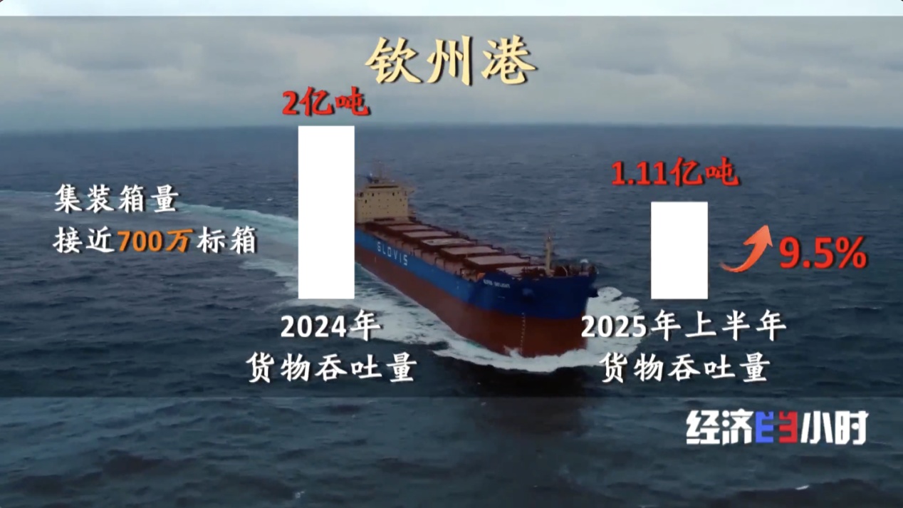 廣西欽州港,是我國西部陸海新通道的重要節點,通過鐵路、公路、水運等多種方式成為中西部貨物出口的集散地。2024年欽州港貨物吞吐量突破2億噸,集裝箱量接近700萬標箱。2025年上半年,欽州港貨物吞吐量達1.11億噸,同比增長9.5%。貨物吞吐量增長的背后,欽州港貨物監管和轉運效率也在悄然發生著變化。