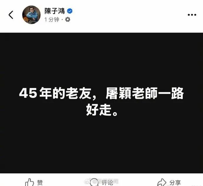 11月1日,著名音樂(lè)人、臺(tái)灣歡喜音樂(lè)唱片公司總經(jīng)理陳子鴻在社交平臺(tái)發(fā)文確認(rèn)了著名音樂(lè)人屠穎離世的消息,陳子鴻寫道:“45年的老友,屠穎老師一路好走。”