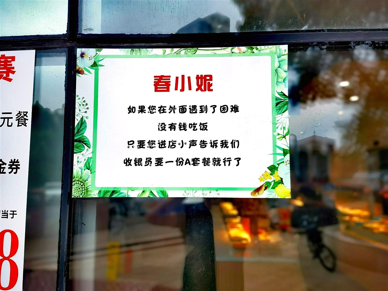 “如果您在外面遇到了困難,沒有錢吃飯,只要您進店小聲告訴我們收銀員,要一份A套餐就行了。”在春小妮餐廳正門口顯眼處,有一張從2020年開店起就貼著的海報。